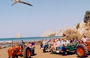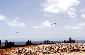 The Gannet, a member of the Booby family, is related to the families of shags, pelicans and frigate-birds. Adult Australasian Gannets have a wing span of up to 2 metres and an average weight of 2kgs. Whilst ungainly on land, these birds are designed for graceful flying and diving from great heights into the sea to catch fish. As the birds are migratory, the first trip for the new chicks is to Australia where they stay for 2 - 3 years before they return to New Zealand to live. Access to the colony is via a number of methods - a trek around the coast from Te Awanga on foot, sitting on the back of tractors with Gannet Beach Adventures that meander along the beach, overland by 4WD or even on kayaks.